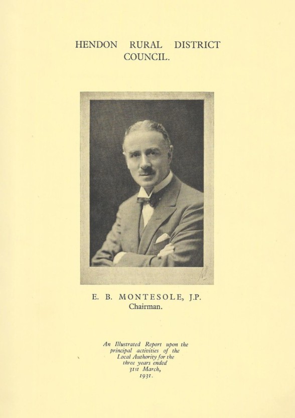 The Chairman of the Council at this time was Edward Bernard Montesole (1883-1976) of East House, Moss Lane; he held the position of Chairman of Hendon RDC from 1930 to 1933. Montesole was rural district councillor for the Pinner Village ward (1927-34) and Middlesex County Councillor for the Pinner electoral division (1933-37). He donated the land known as Montesole Playing Fields for public use and was instrumental in persuading Hendon RDC to purchase Headstone Manor.