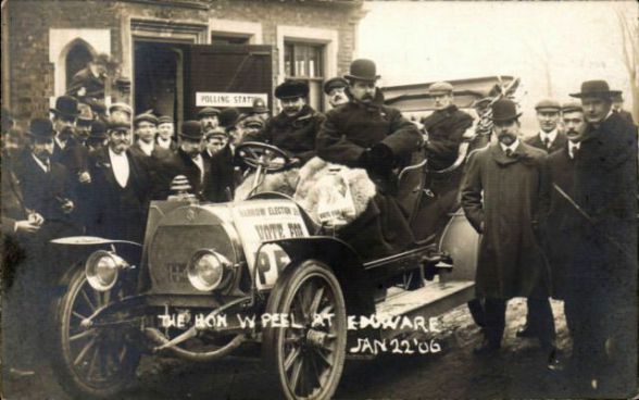 The first photo, distributed as a post card, shows Peel in a motor car outside a polling station at Edgware.
