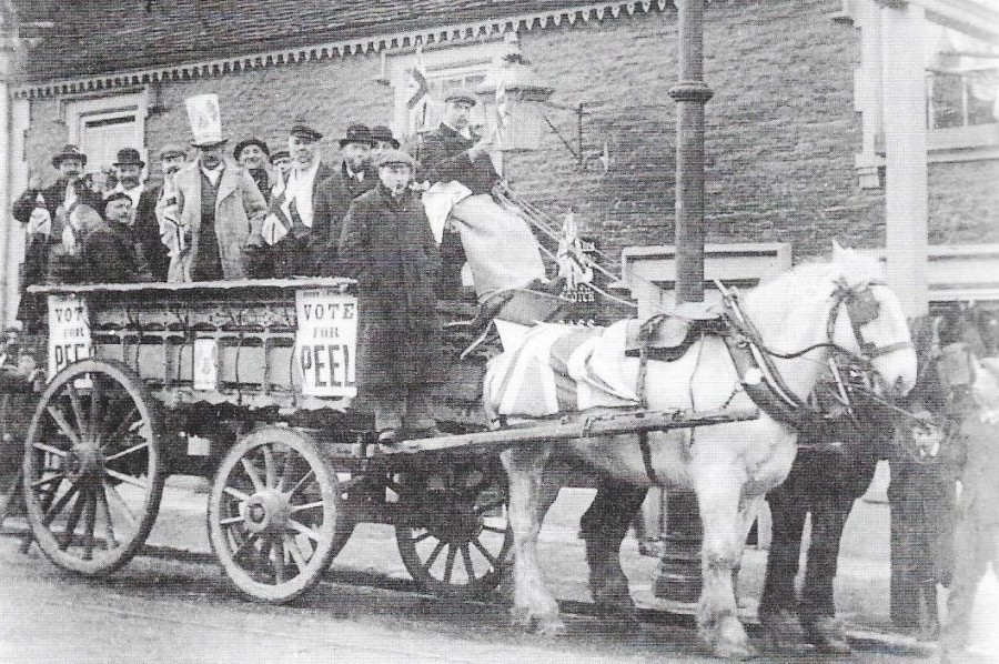 The second photograph is of the Clutterbuck (Stanmore) Brewery's horse and dray, decorated with flags and posters, taking voters to the poll: