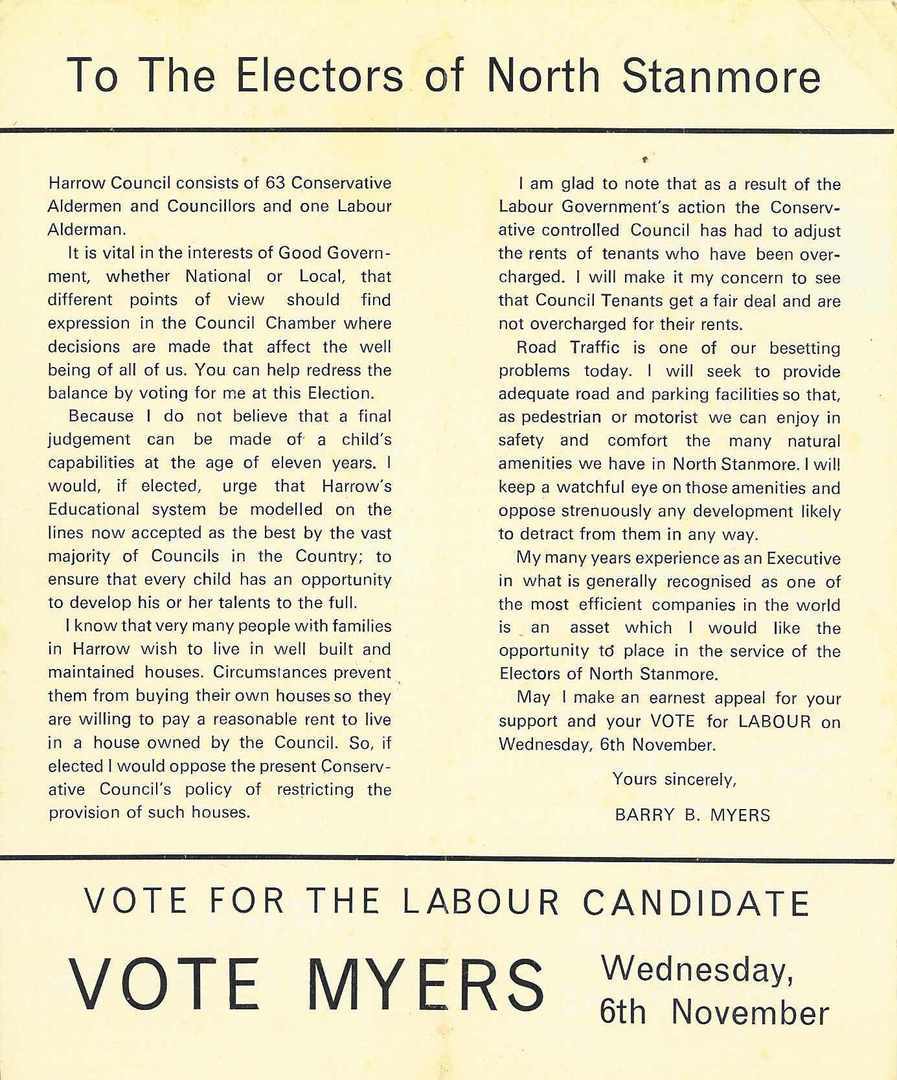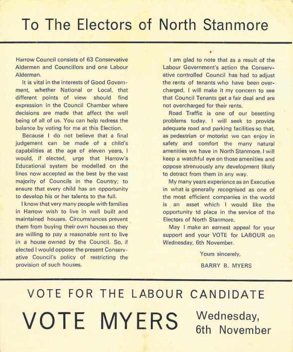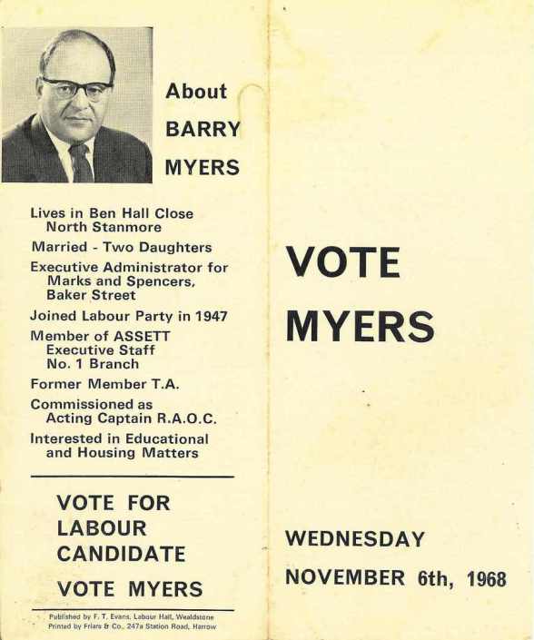 Barry Myers (Lab), Stanmore North 1968 by-election: