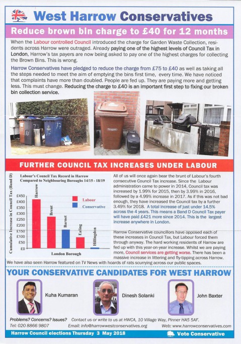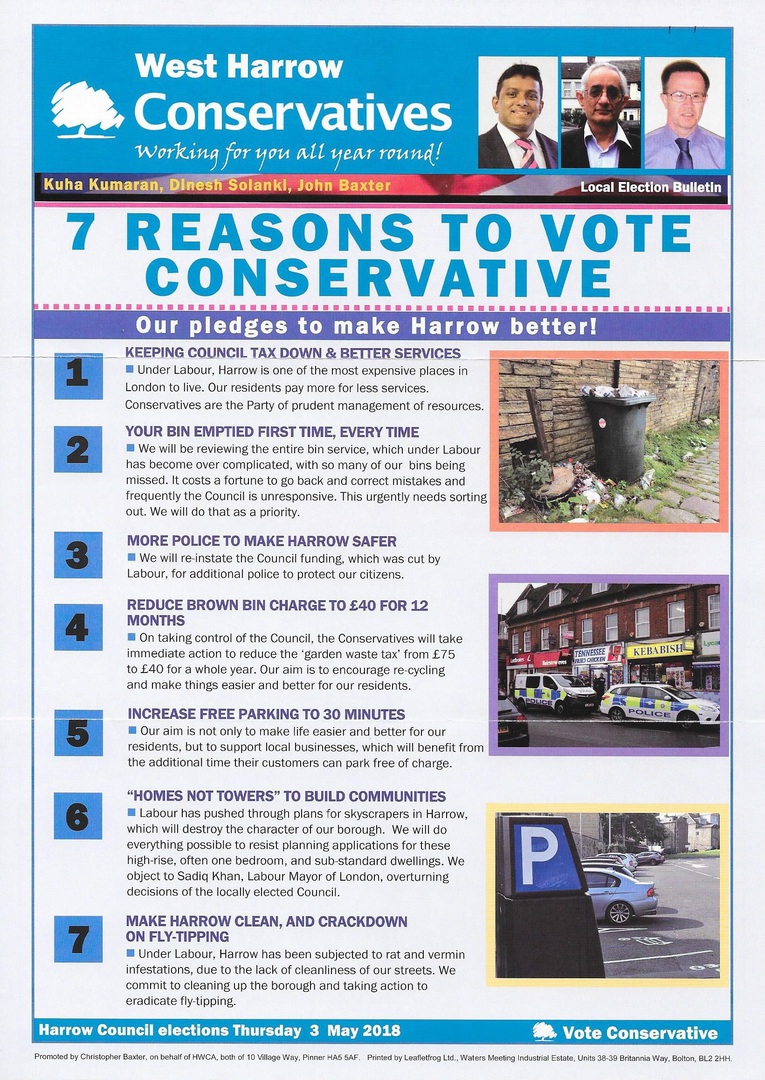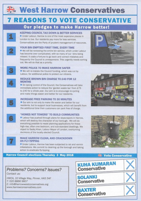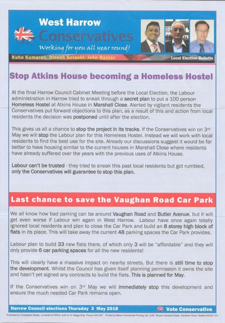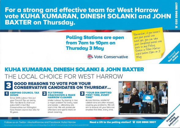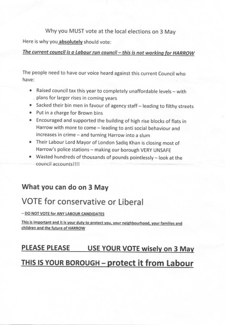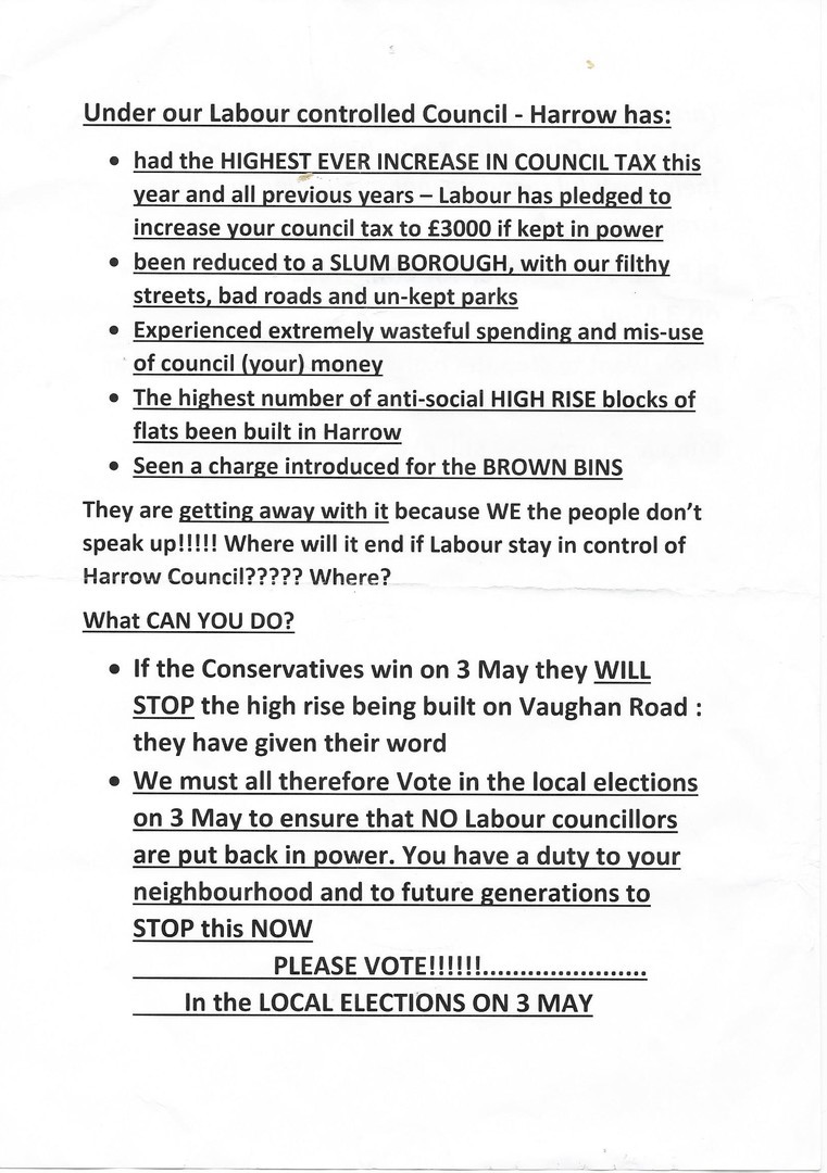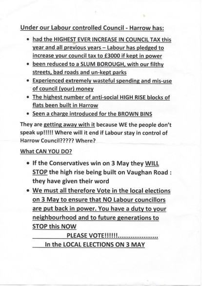 This leaflet was distributed and fly-posted in West Harrow. It bears no imprint and probably breaches s110 of the Representation of the People Act 1983 and/or s143 of the Political Parties, Elections and Referendums Act 2000. Its origins are unknown.