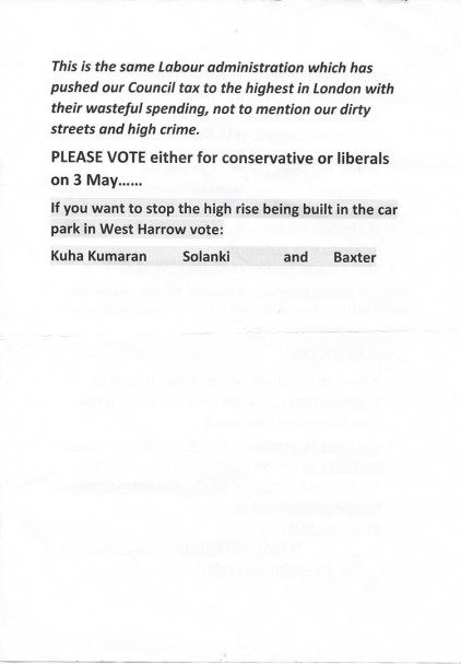 This leaflet was distributed and fly-posted in West Harrow. It bears no imprint and probably breaches s110 of the Representation of the People Act 1983 and/or s143 of the Political Parties, Elections and Referendums Act 2000. Its origins are unknown. The front of the leaflet is shown as the first image, the back as the second.
