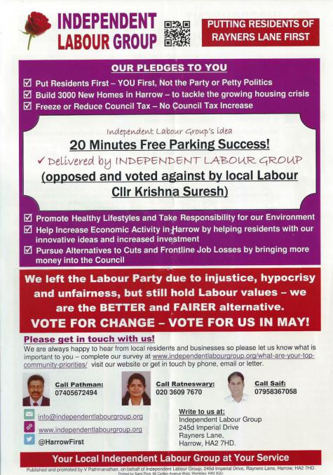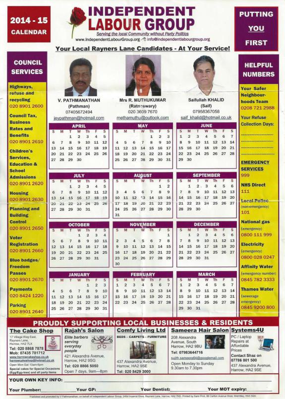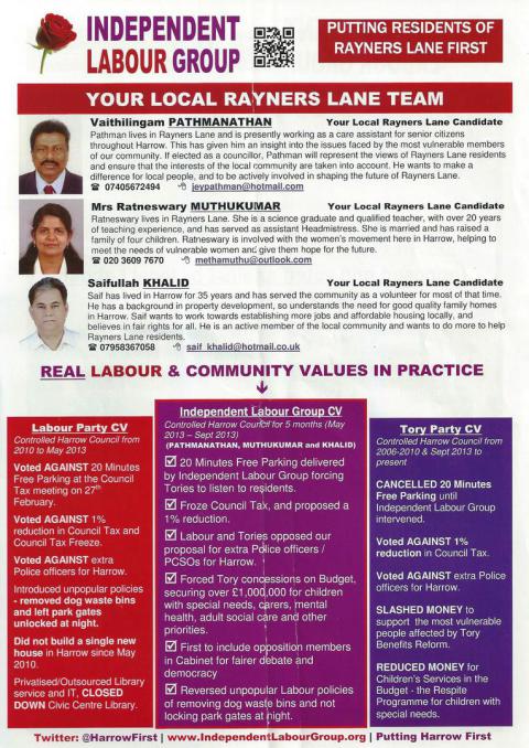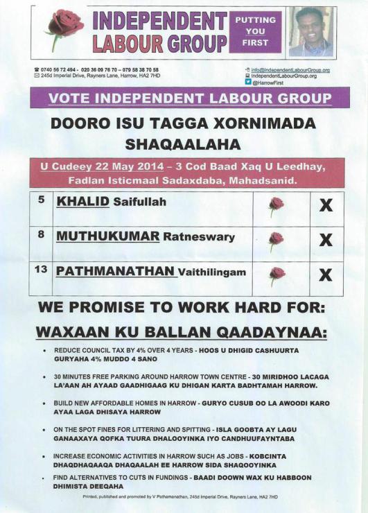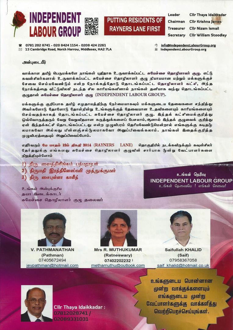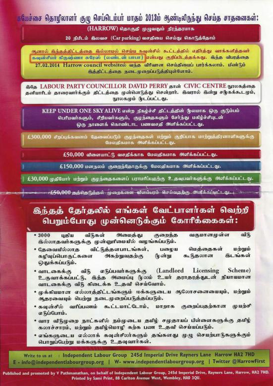 The front and back of a leaflet aimed at the Tamil community within the ward.