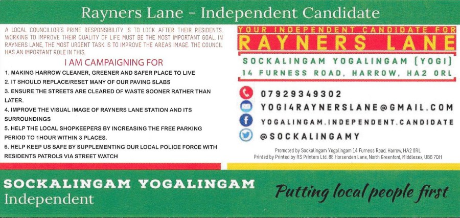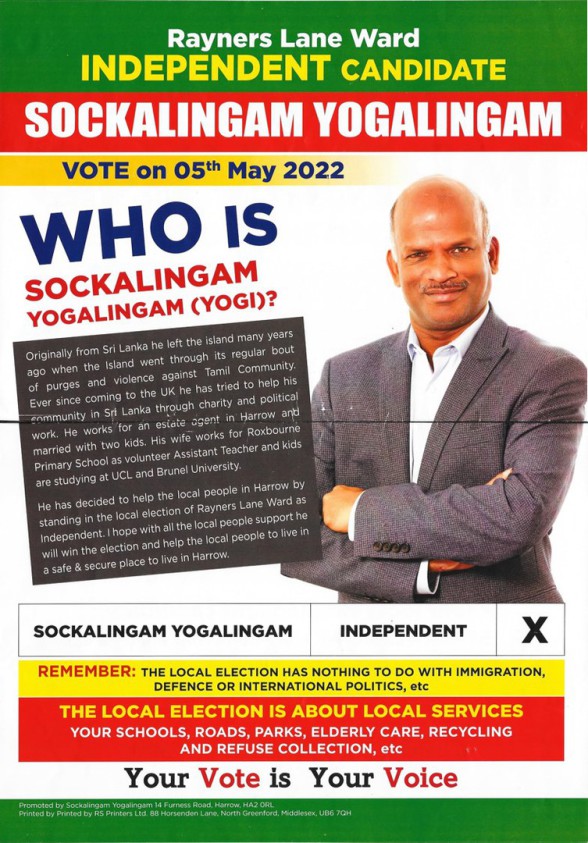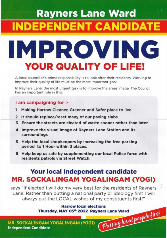 Yogalingam distributed a large election address in A3 size. The illustrations below show the front and the back of the leaflet. [Each image consists of separate scans of the top and bottom of the side, carefully 'stitched' together.]